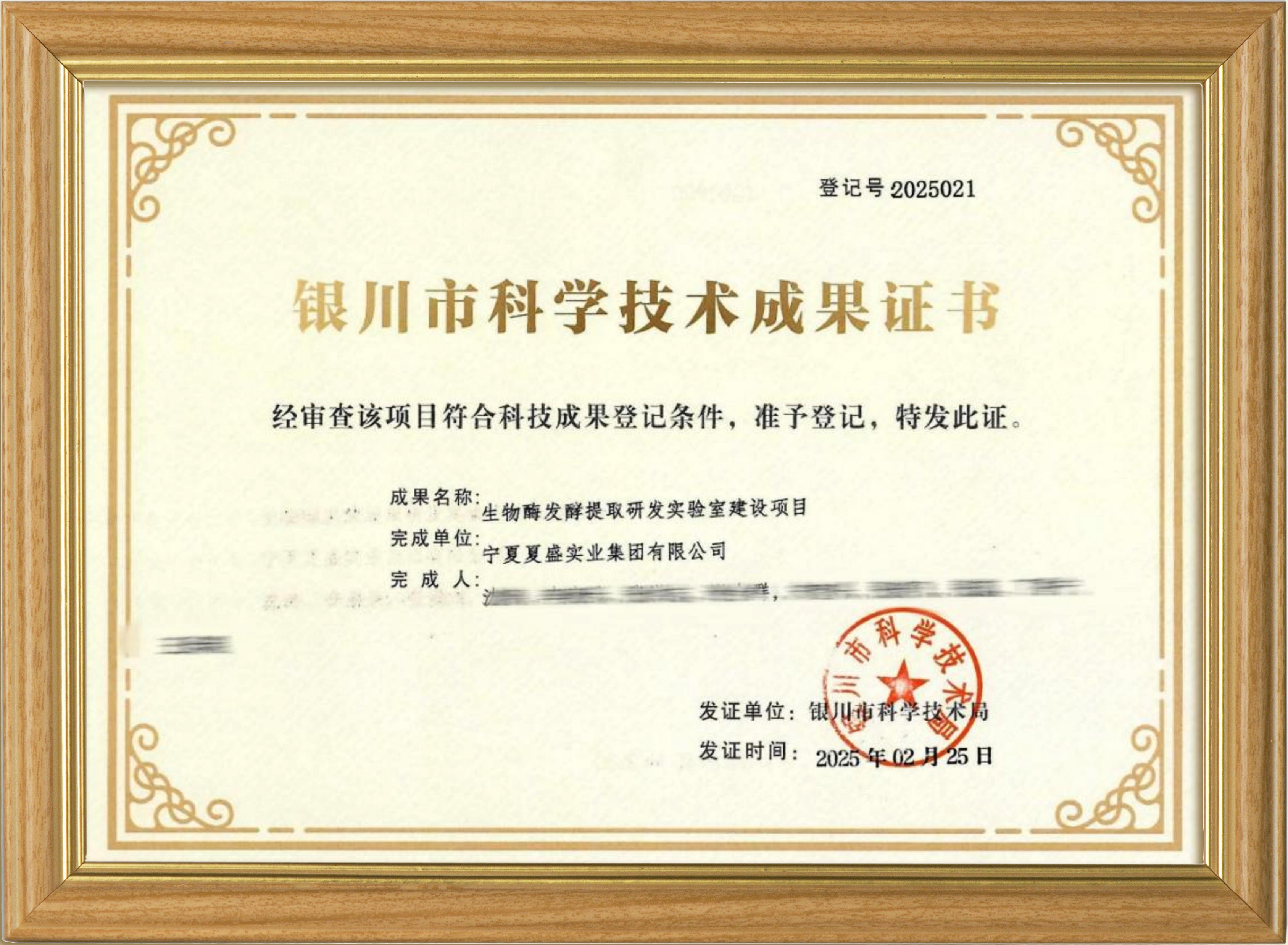 2025年2月25日,夏盛集团凭借“生物酶发酵提取研发实验室建设”项目成果,荣获银川市科学技术局颁发的科学技术成果证书!